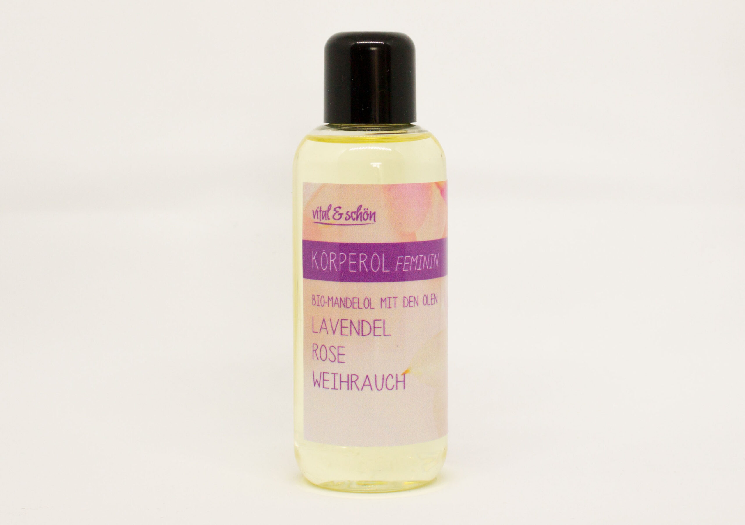 Das Körperöl „Feminin“ beinhaltet die echt ätherischen Öle Lavendel, Rose und Weihrauch.